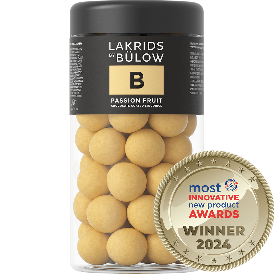 Søt lakris ikledd nøye utvalgt hvit sjokolade og forførende pasjonsfrukt. Sjokoladens sødme, pasjonsfruktens syrlighet og lakrisens evne til å forene smaksopplevelsene gir den perfekte smaken. Søtt, syrlig og suverent – dekket av et delikat, sprøtt sukkerskall.