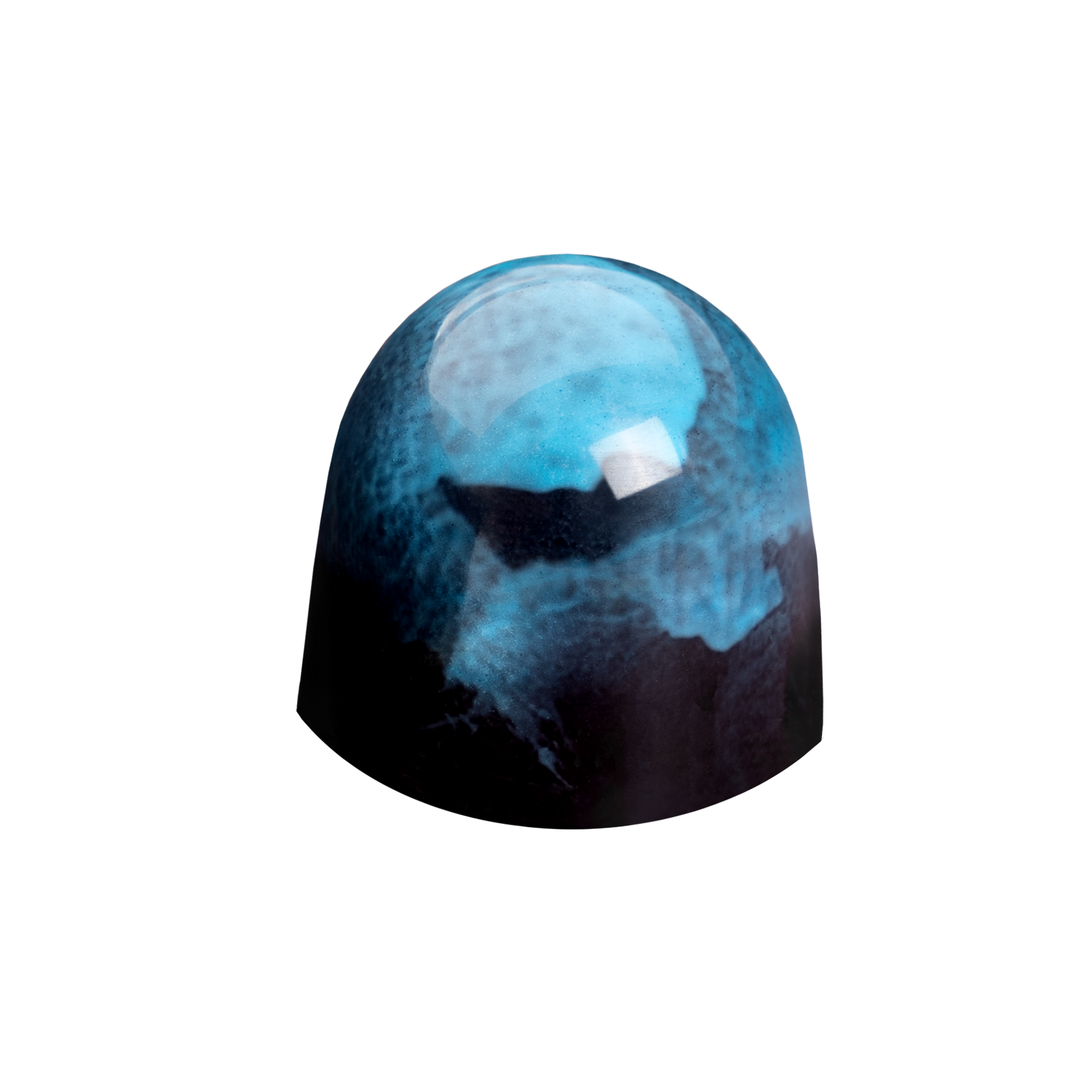 Et lag vanilje sammen med et lag friske blåbær trukket i mørk sjokolade