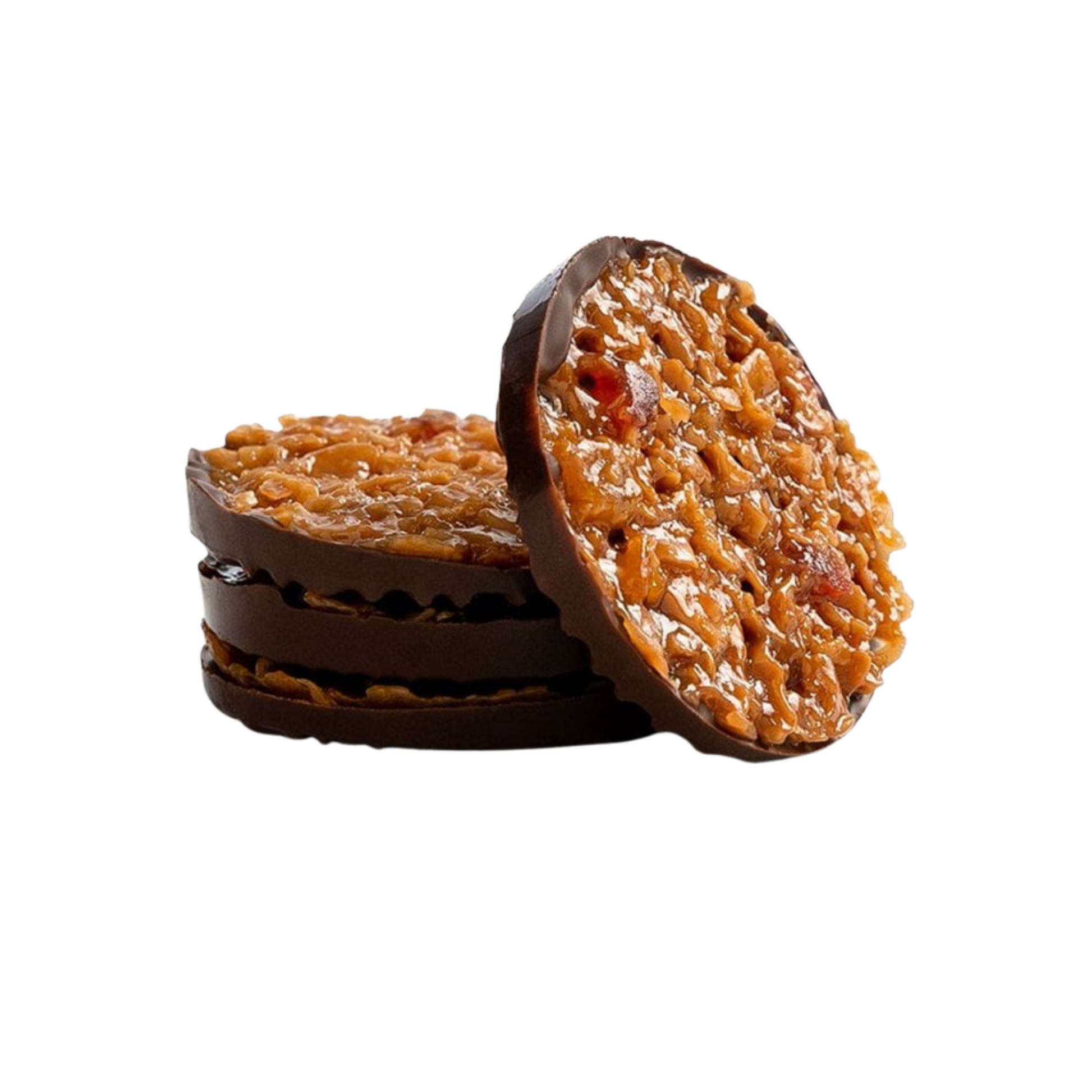 Disse små belgiske mesterverkene kombinerer sprøtt, karamellisert nøttefyll med et luksuriøst lag av belgisk mørk sjokolade. Først kjenner du den fløyelsmyke, rike sjokoladen som smelter på tungen, så følger den sprø og aromatiske florentinbunnen med nøtter. En perfekt balanse mellom søtt, nøtteaktig og lett bitterhet.