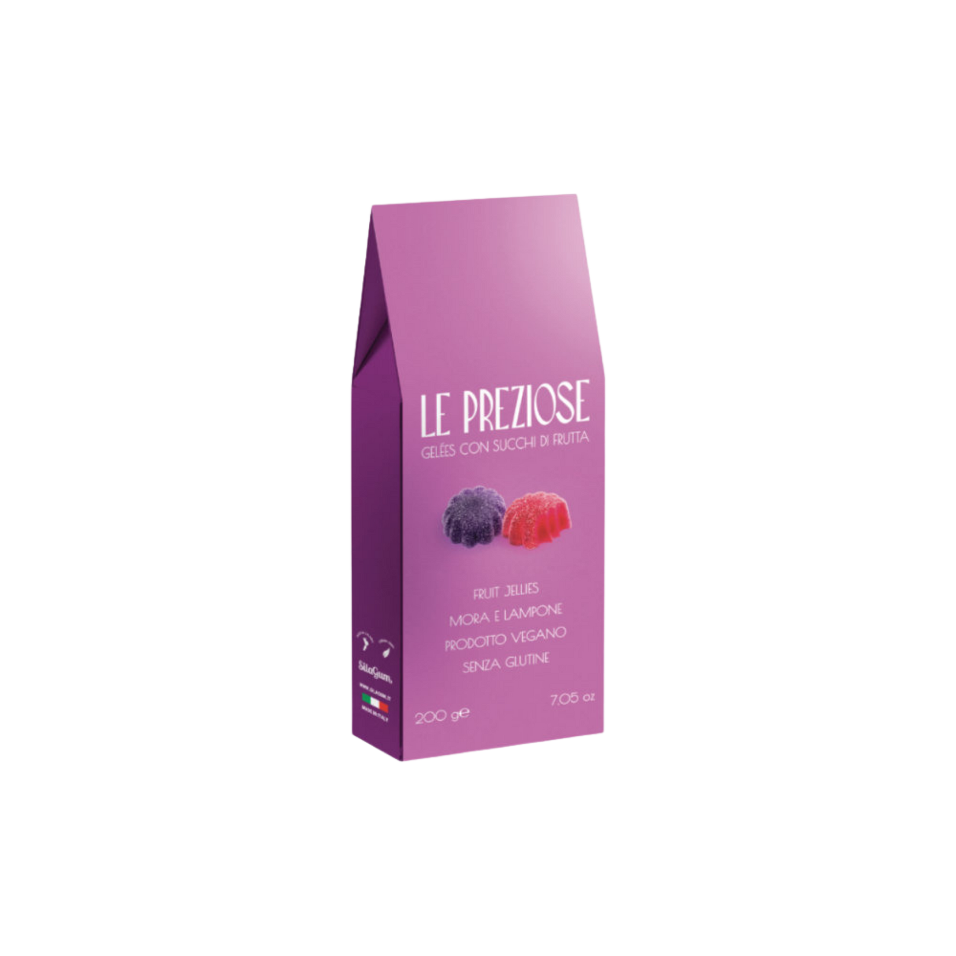 Opplev en liten bit av italiensk eleganse med Silagum Le Preziose, luksuriøse gelefrukter med intens smak av bringebær og bjørnebær. Hver bit er silkemyk, fylt med fruktig sødme og laget for å friste sansene - perfekt å nyte som en liten luksus når som helst, alene eller sammen med gode venner. Små mesterverk av smak, i hver gelebit.
