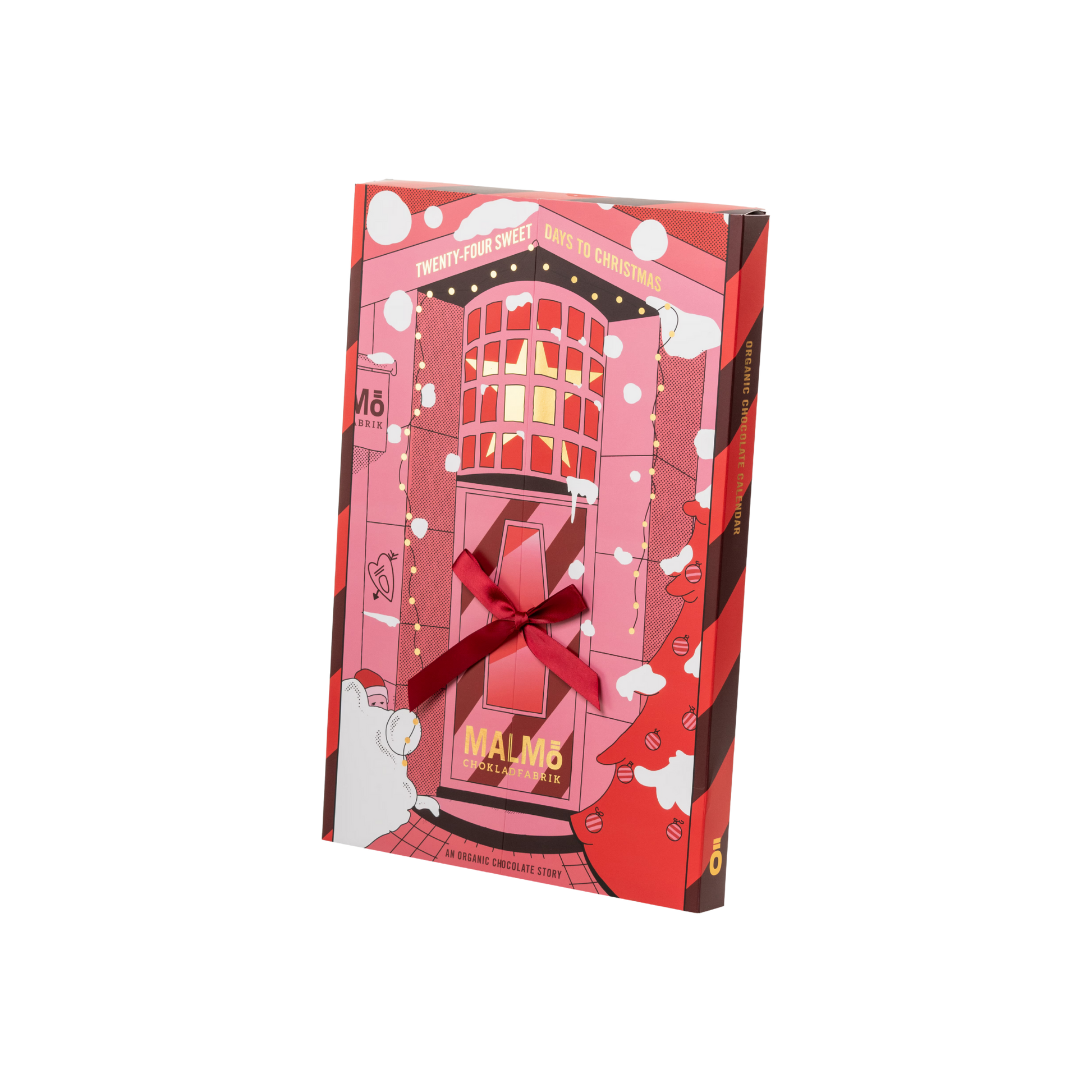 Tell ned til jul med ekte sjokoladehåndverk fra Malmö Chokladfabrik. Bak hver av de 24 lukene venter økologisk, håndlaget sjokolade - helt fri for nøtter, gluten, soya og egg.