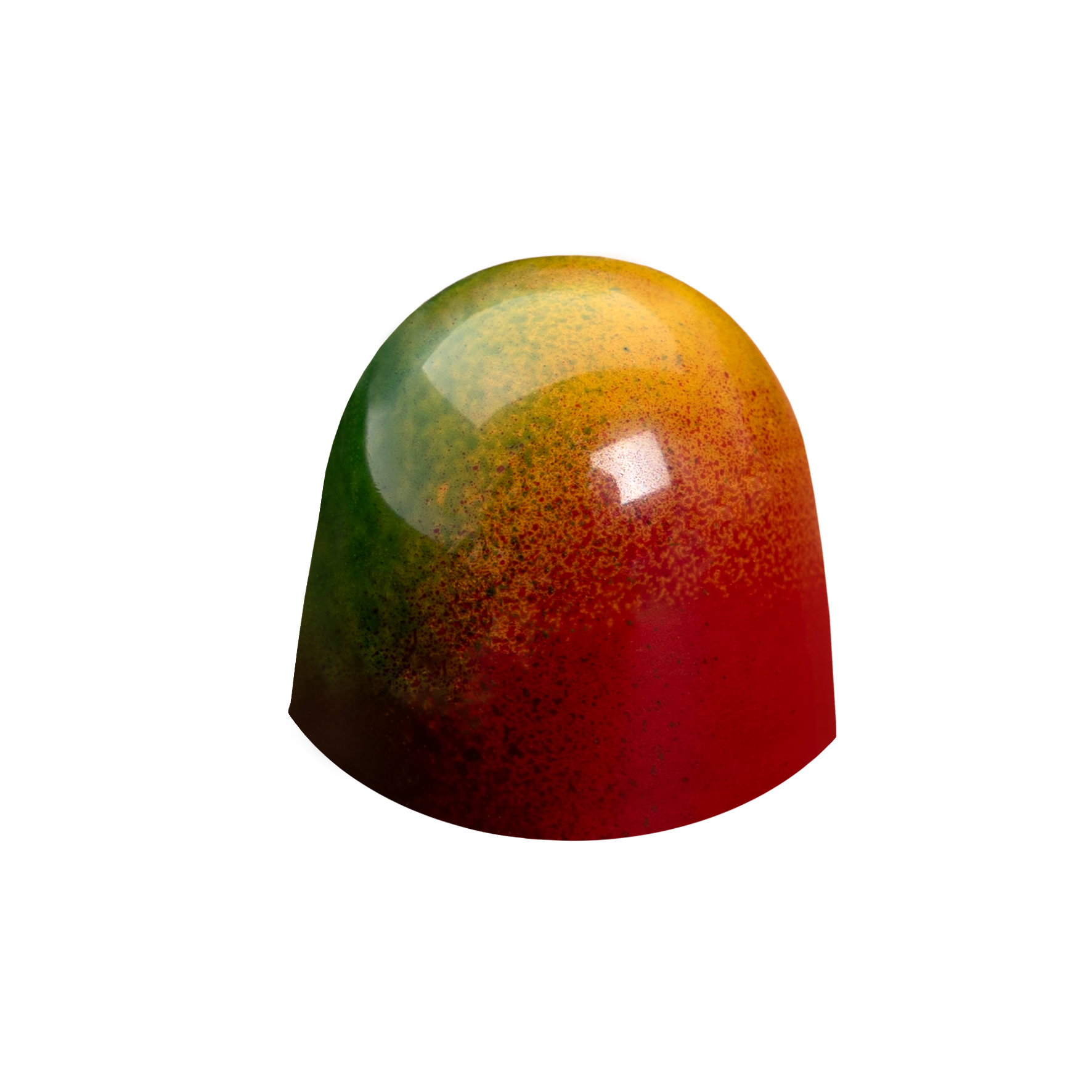 Et lag med karamell sammen med kremet mangofyll - trukket med melkesjokolade.