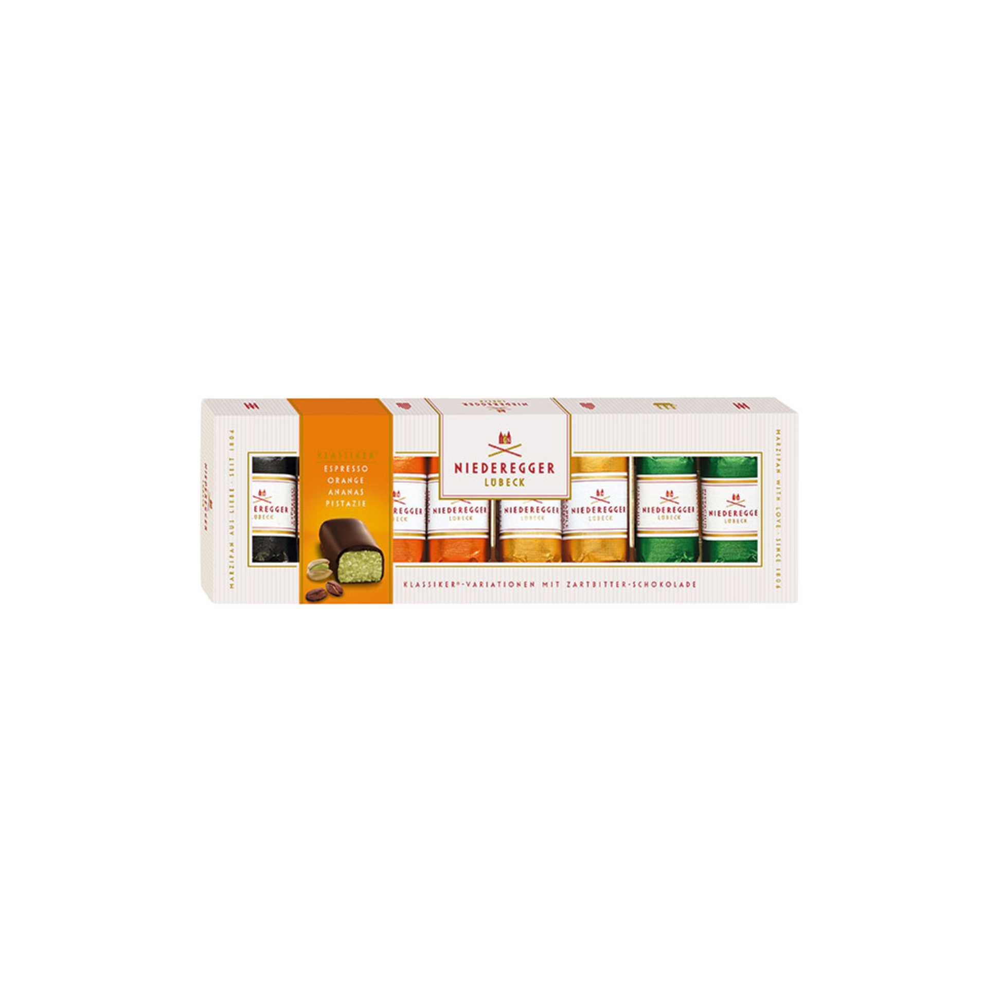 Oppdag det beste fra Lübeck på ett brett! Denne klassiske assorteringen kombinerer silkemyk marsipan med et lekent utvalg av smaksvarianter - fra sjokoladeovertrukket til nøttefylte overraskelser - alle laget med den ikoniske Niederegger-kvaliteten. Hver bit er et lite mesterverk, nøye balansert mellom sødme, tekstur og ren nytelse.