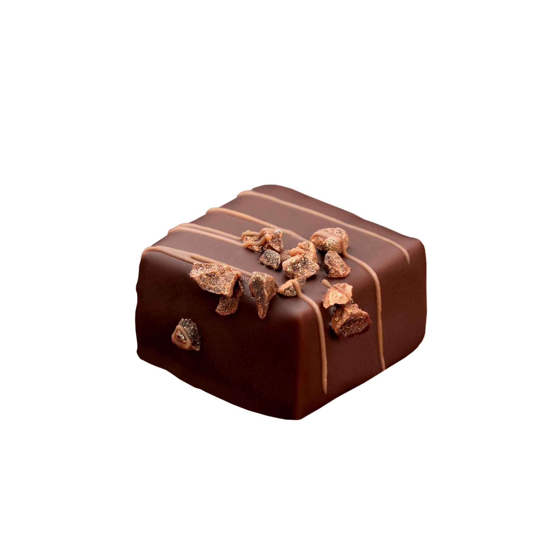 Mørk sjokolade med et hint av salt og karamell. Pyntet med rå kakao.