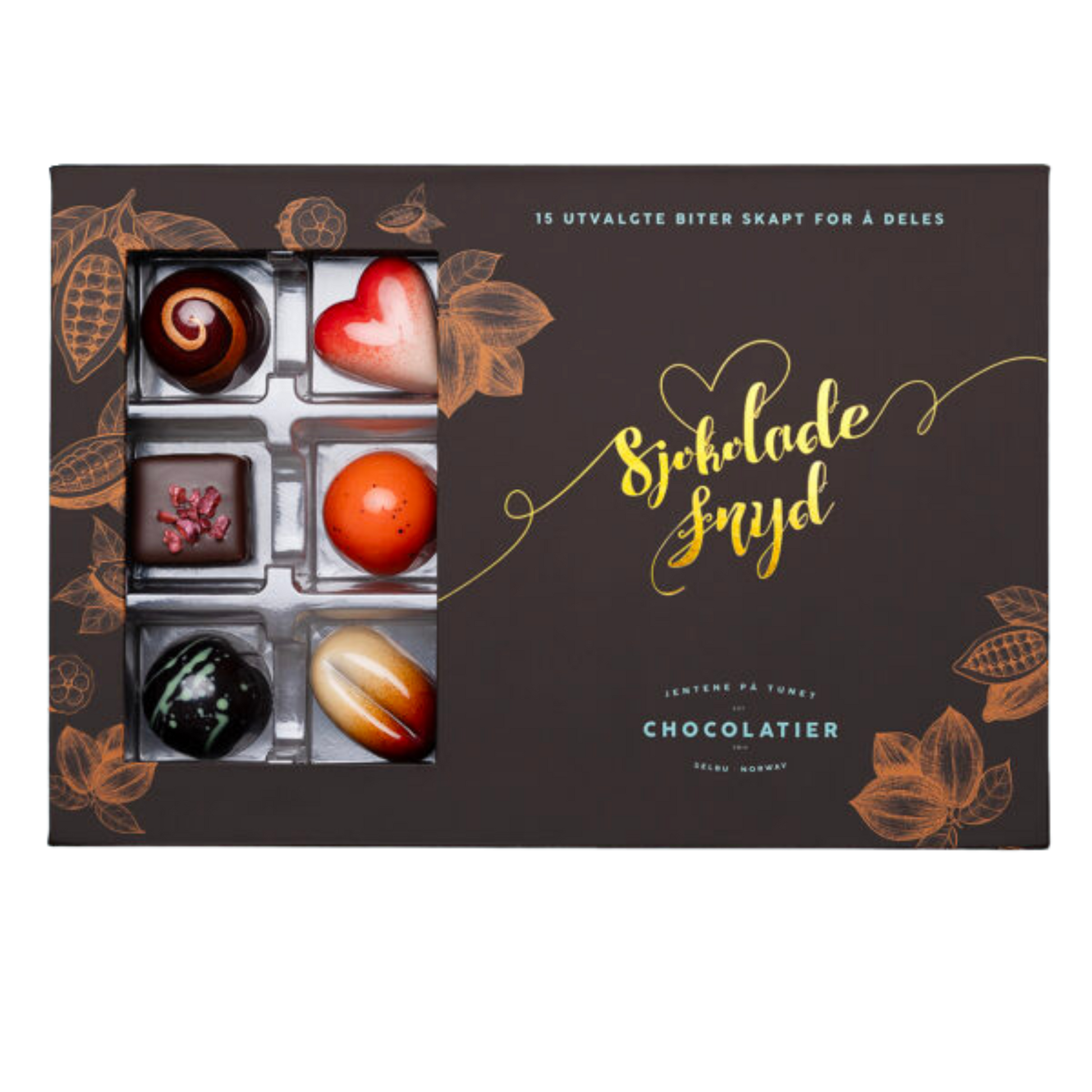 En stor gaveeske med 15 ulike favoritter med Sjokoladefryd – som et smykkeskrin med små håndmalte sjokoladekunstverk! En gave som skaper entusiasme og blir en skikkelig snakkis – stas å gi, enda mer stas å få.