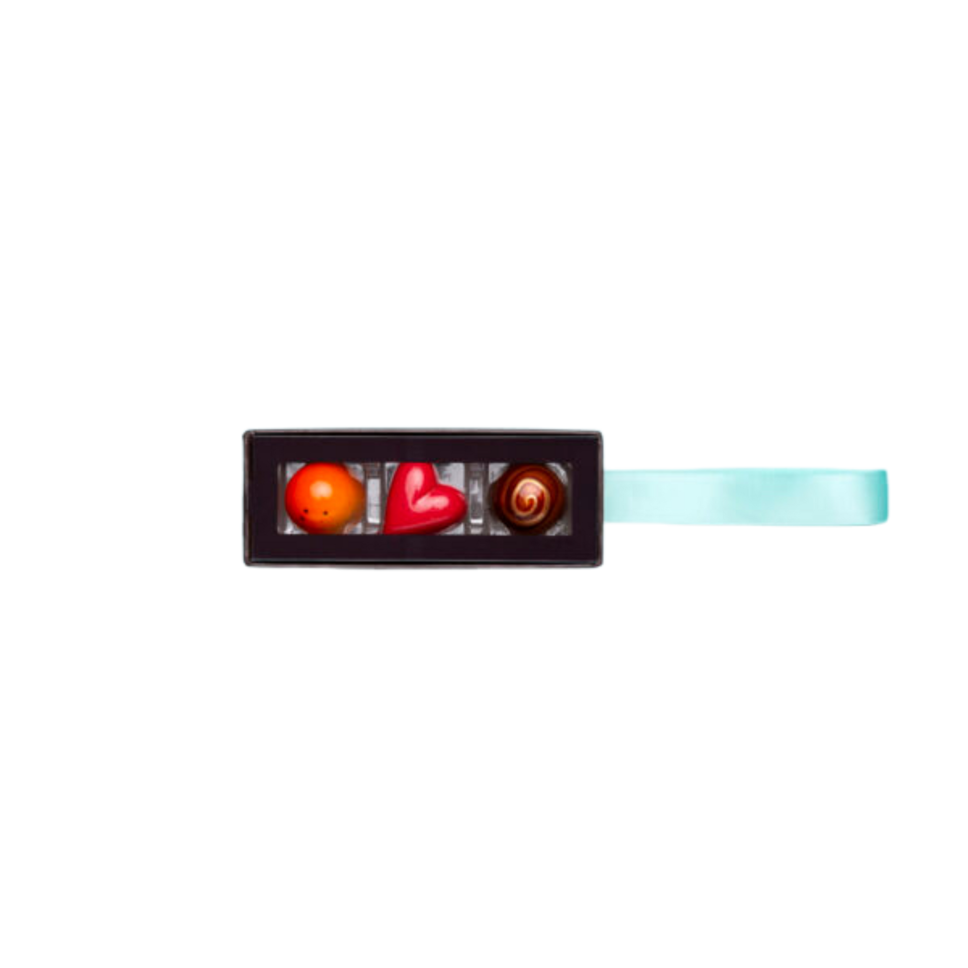 Håndlaget sjokolade er den perfekte følgesvenn til en vakker blomsterbukett eller en flaske med god drikke. Denne gaveesken med 3 biter Sjokoladefryd har et silkebånd i enden – perfekt for å henge på buketten eller flaskehalsen.