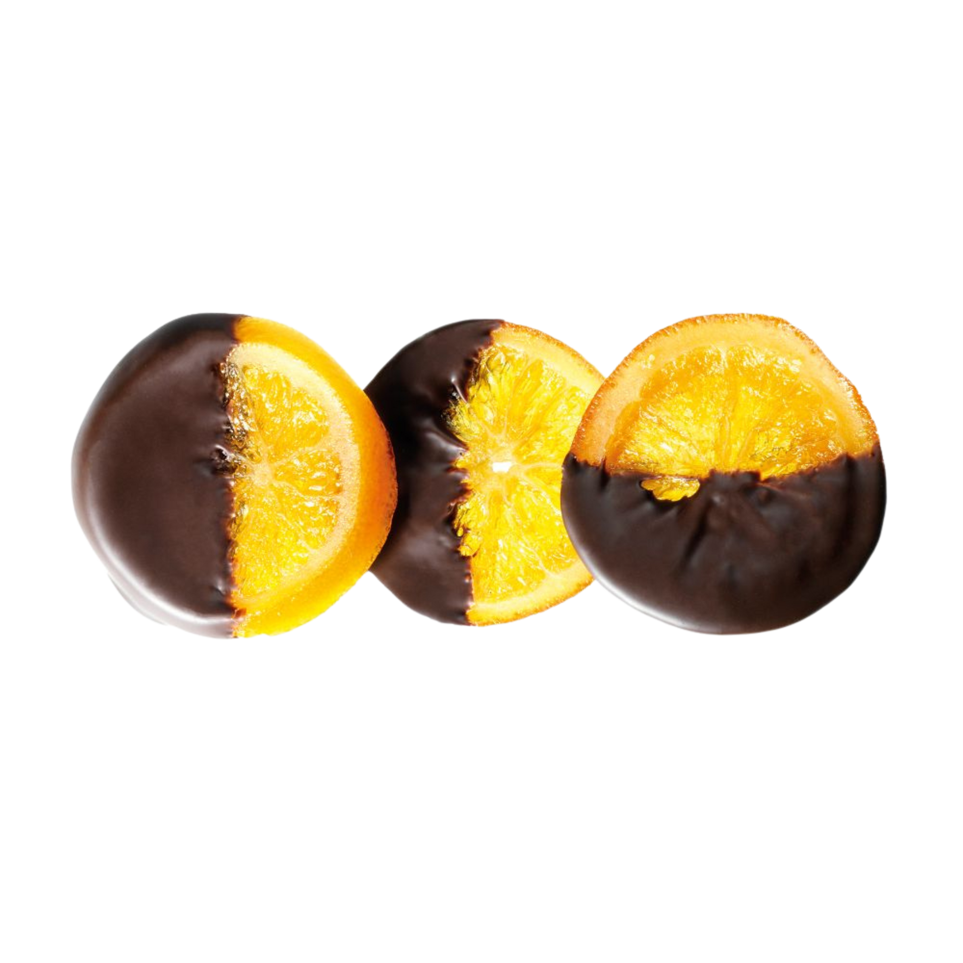 Hver skive er et lite mesterverk: saftig kandisert appelsin, nøye tørket til perfekt sødme og glød, halvt omsluttet av intens, fløyelsmyk belgisk mørk sjokolade. Først treffer den bittersøte sjokoladen smaksløkene, deretter den solrike, friske appelsinen som danser elegant over tungen.
