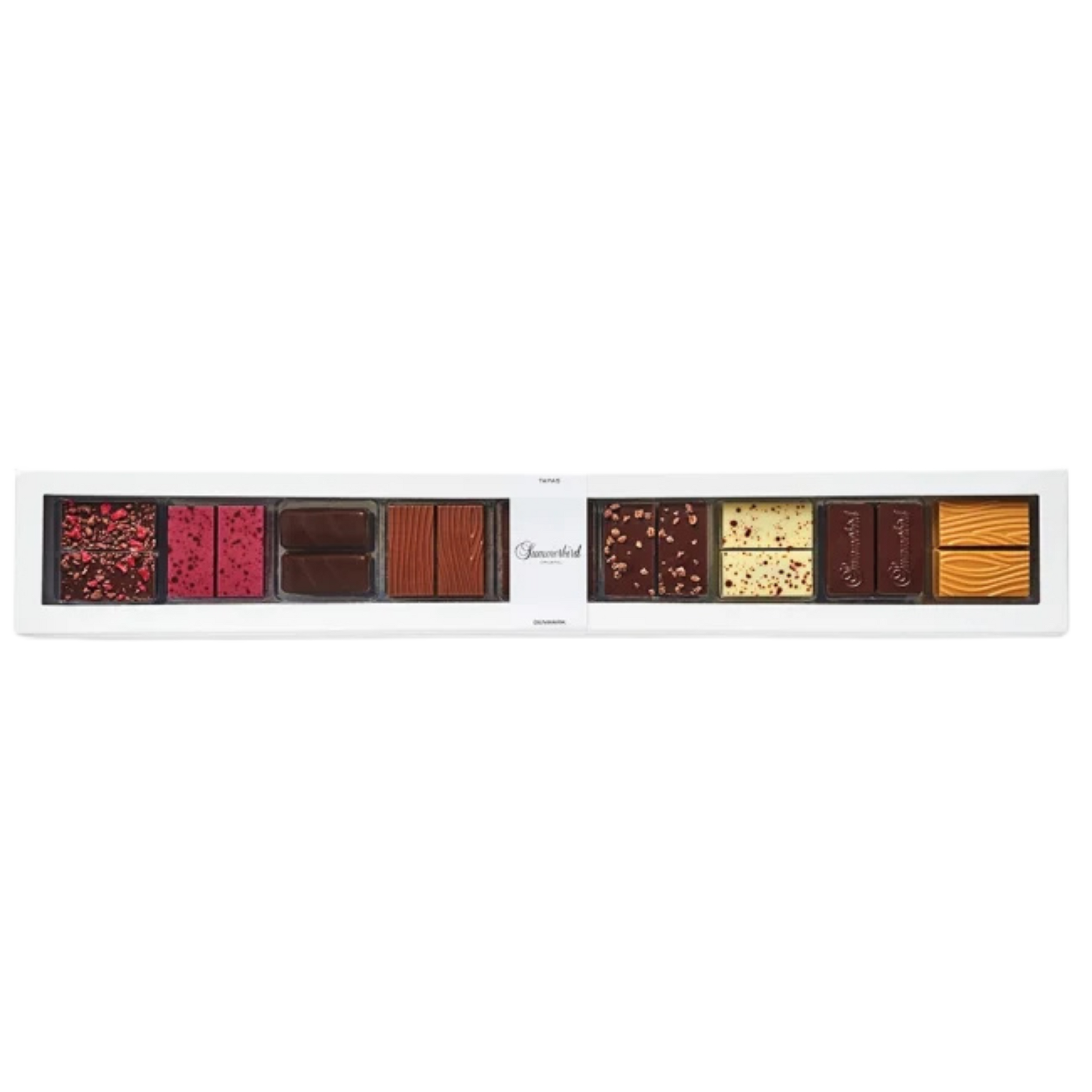 Tapas-gaveesken er en liten samling av sjokoladebiter, hver med sin egen smakshistorie. Den kombinerer gyllen Amber-sjokolade med fyldige nøtter, karamell, marsipan og spennende små smaksdetaljer som havsalt, appelsin og pistasj.